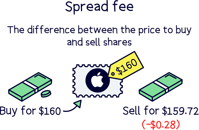 For instance, let’s say you want to trade Apple shares, and the current price to buy a share is $160. This would mean the price to sell an Apple share would be $159.72, because the spread for Apple is 0.18% (fees below), eToro is making $0.28 per trade ($160 - $159.72 = $0.28).