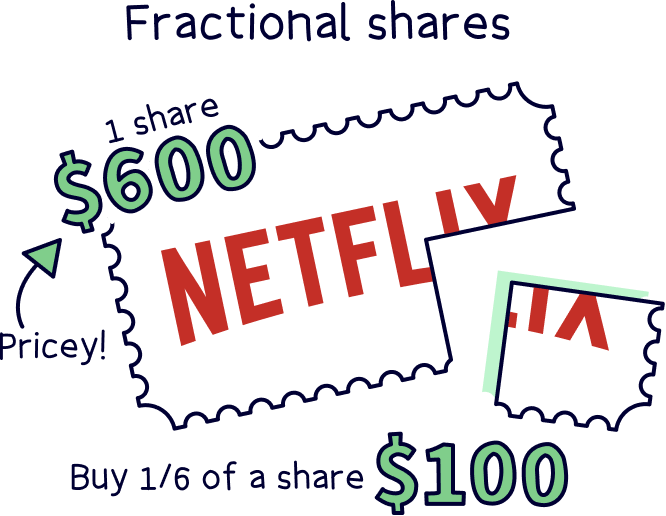 Fractional shares: some shares are expensive, such as Netflix, which has been around $600. With fractional shares, you can simply buy as much as you’d like in cash terms, and receive a fraction of the share instead. For instance, if you want to spend $100, you’ll get 1/6th of a share, rather than having to buy a whole share (1/6th of $600 = $100).